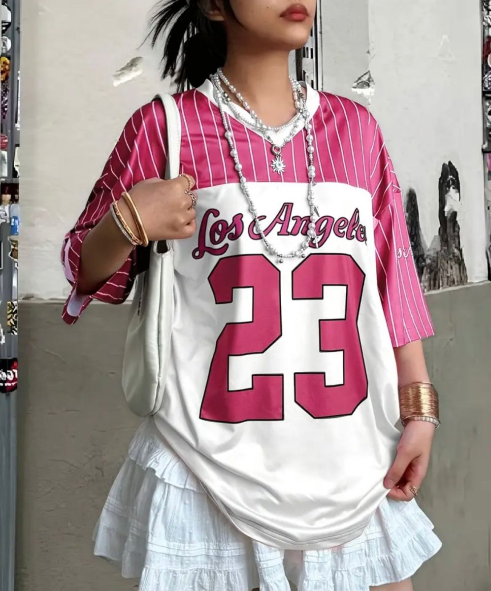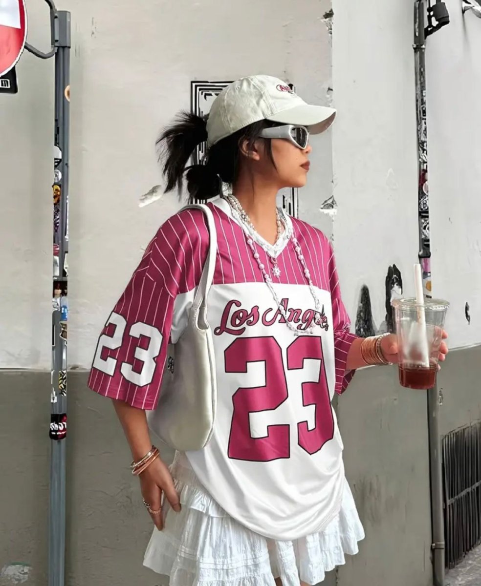 Luce un estilo deportivo con flow callejero con este jersey inspirado en la esencia de Los Ángeles. Su diseño con rayas verticales en tono burdeos y el número 23 en grande le dan ese aire retro que nunca pasa de moda.