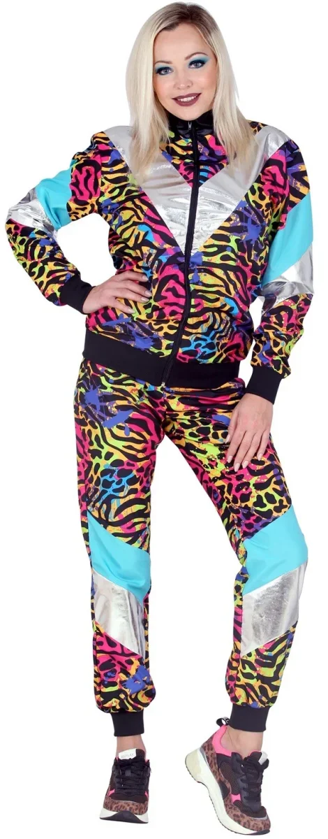 ¿Buscas el chándal ochentero más original para tu fiesta de disfraces? Este modelo de tejido de táctel con estampado de tigre de colores neón hará que te conviertas en el foco de atención de tu fiesta de los años 80.