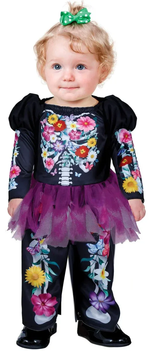 ¿Estás buscando un disfraz de esqueleto para tu bebé? Con el disfraz de esqueleto catrina para niña con huesos con flores y tutú tendrás el traje perfecto para disfrazar a tu hija como un colorido y simpático esqueleto y será la niña más guapa de la fiesta de Halloween.