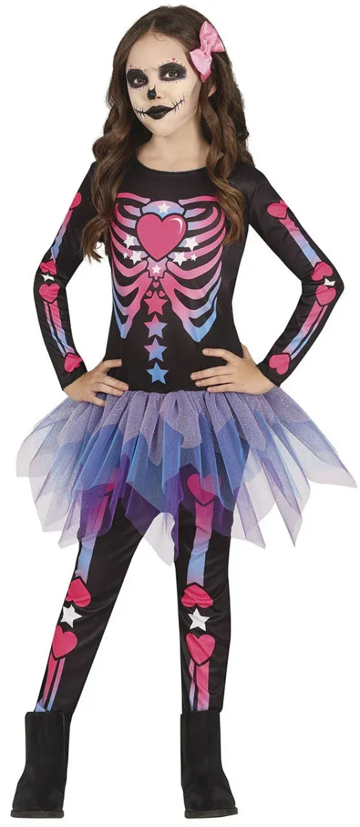 ¿Buscas el vestido de Halloween más cómodo para la más peque de la casa? Este modelo para niña de esqueleto colorido en rosa y morado con tutú y estampado de corazones le encantará para convertirse en el centro de atención de su fiesta en el día más terrorífico del año.