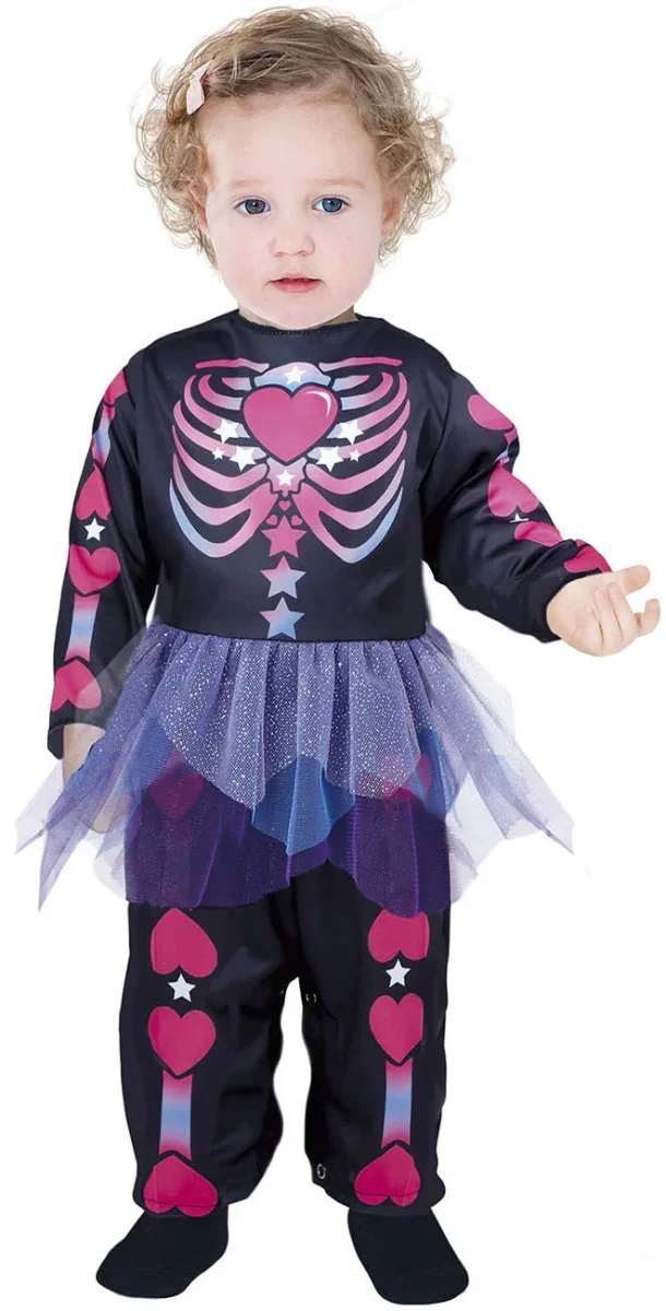 ¿Estás buscando el traje de esqueleto perfecto para tu bebé? Con el disfraz de esqueleto colorido para niña con corazón, huesos y tutú tendrás el vestidito perfecto para disfrazar a tu hija como un colorido y simpático esqueleto y será la niña más guapa de la fiesta de Halloween.