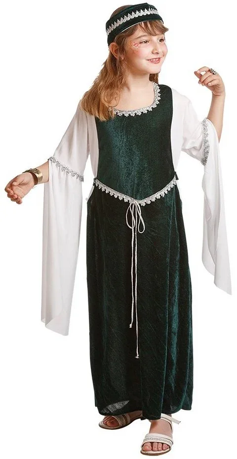 ¿Buscas el vestido medieval más auténtico para la más peque de la casa? Este modelo de princesa en color verde con mangas blancas hará que tu niña se convierta en el centro de todas las miradas en su feria medieval.