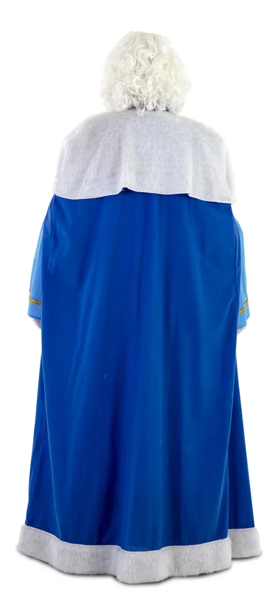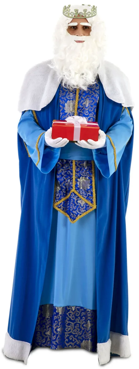¿Buscas el traje de rey melchor más original y vistoso? Este modelo en color azul con brocado en dorado te convertirá en el centro de atención de tu fiesta navideña.